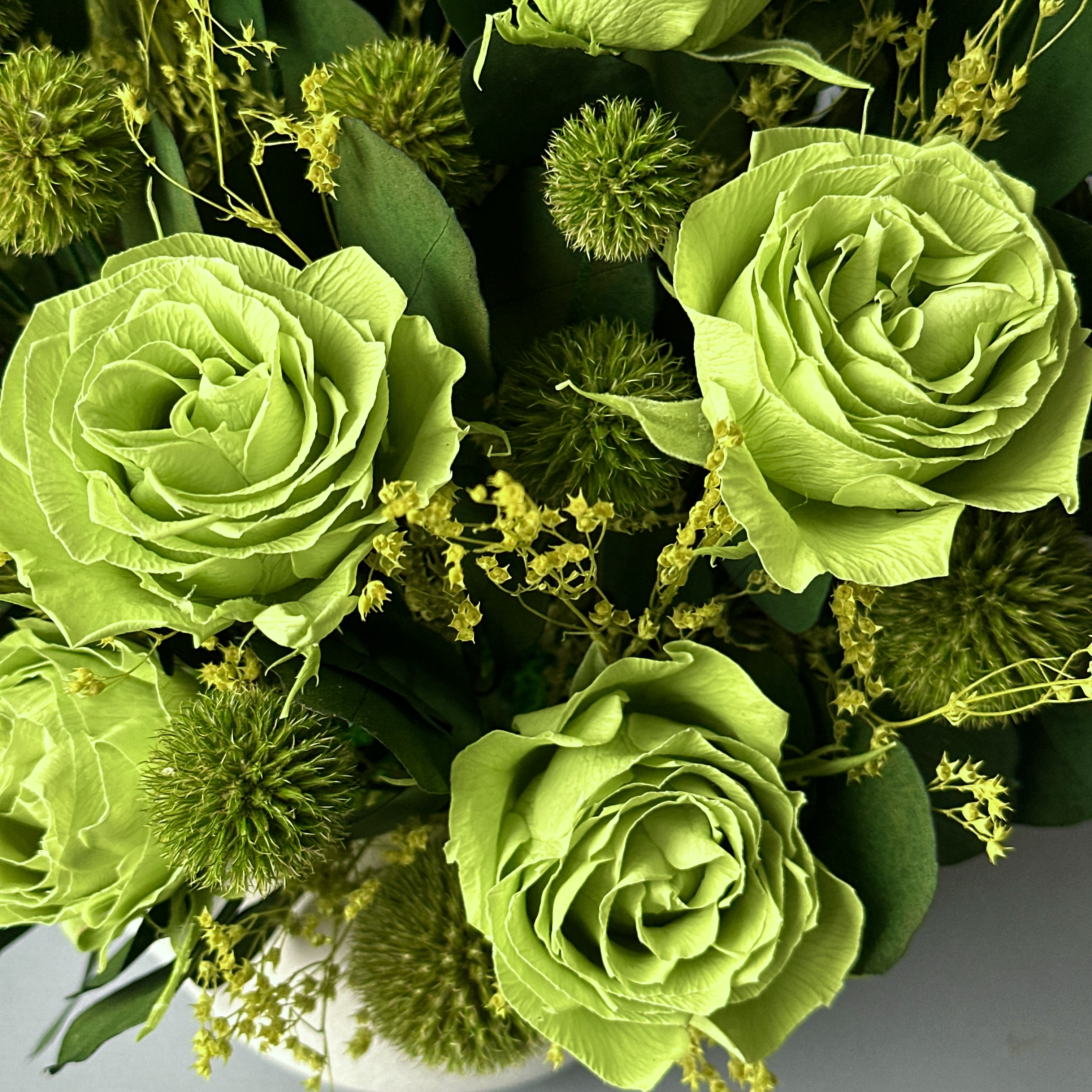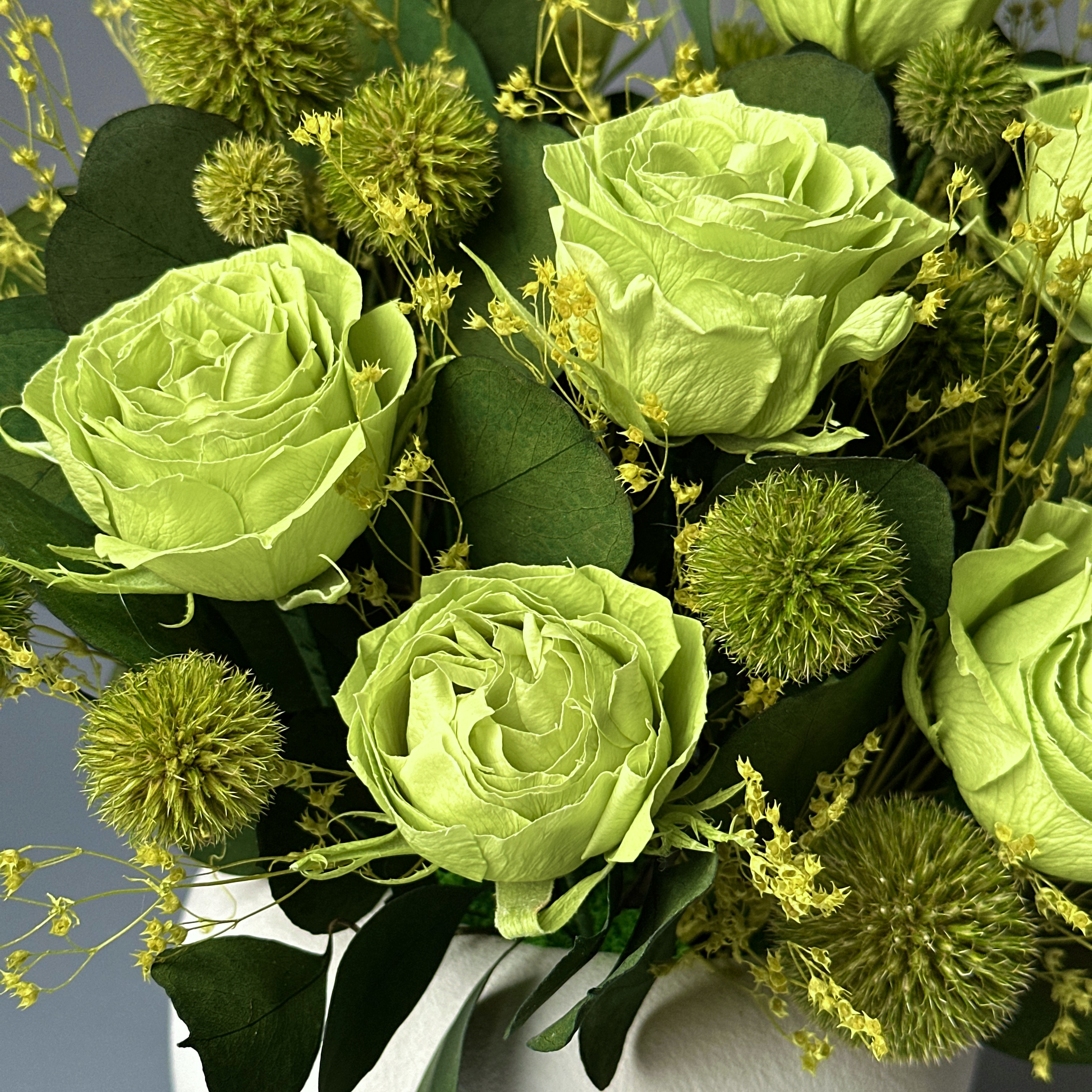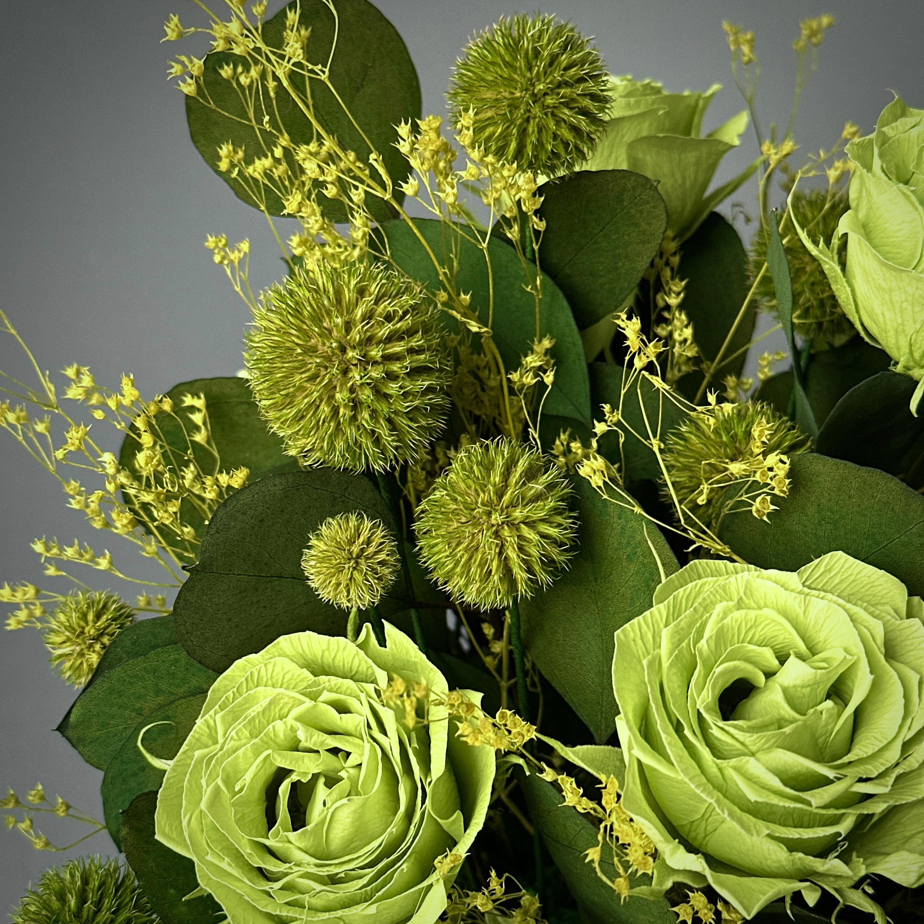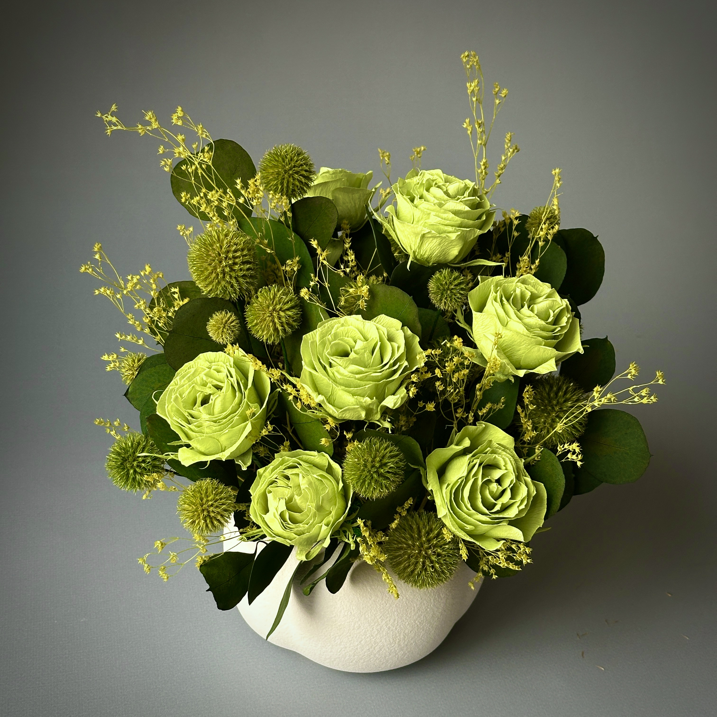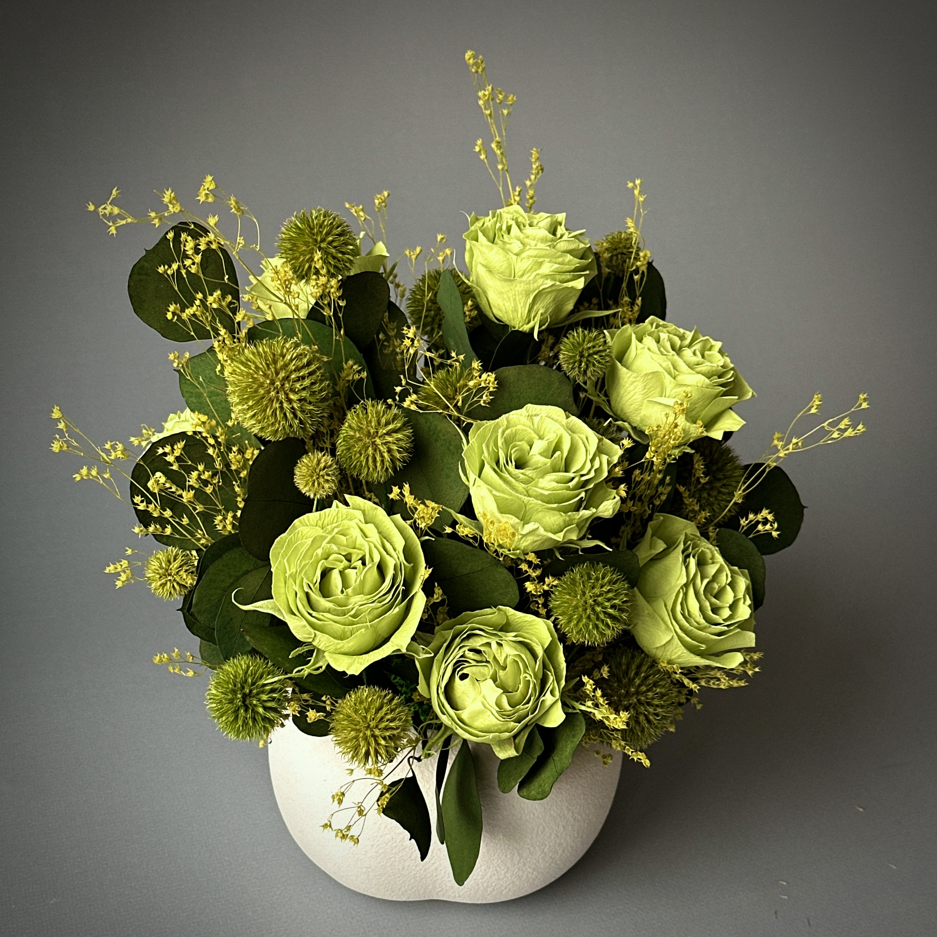 Гармоничная композиция из стабилизированных цветов в благородных зеленых оттенках словно кусочек природы, укрытой тишиной и спокойствием. Глубокая зелень наполняет пространство свежестью, а натуральные фактуры создают ощущение тепла даже в самый холодный день. Гармонично вписывается в любой стиль, добавляет жизни и света. Эта композиция - про спокойствие, баланс и ощущение природы рядом.