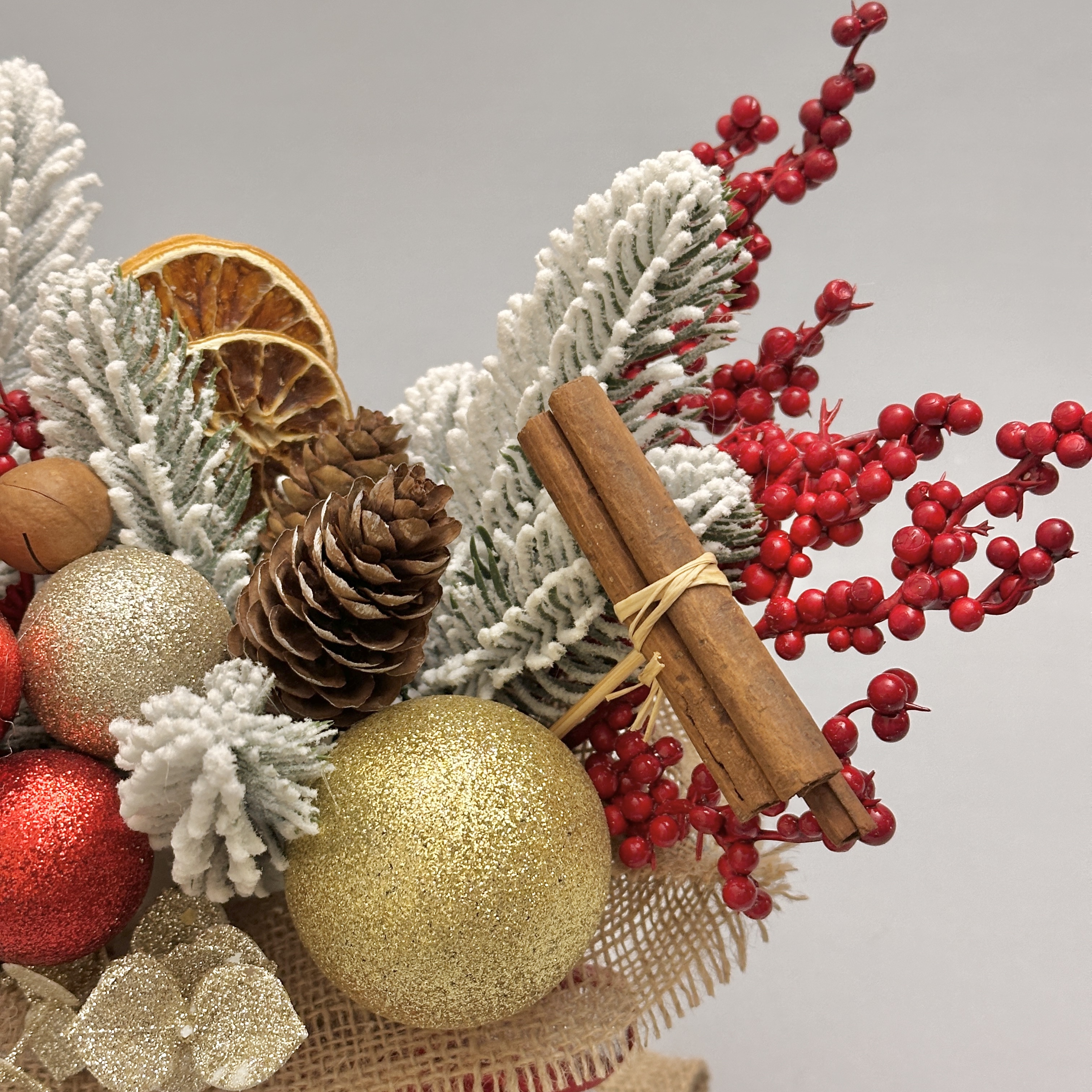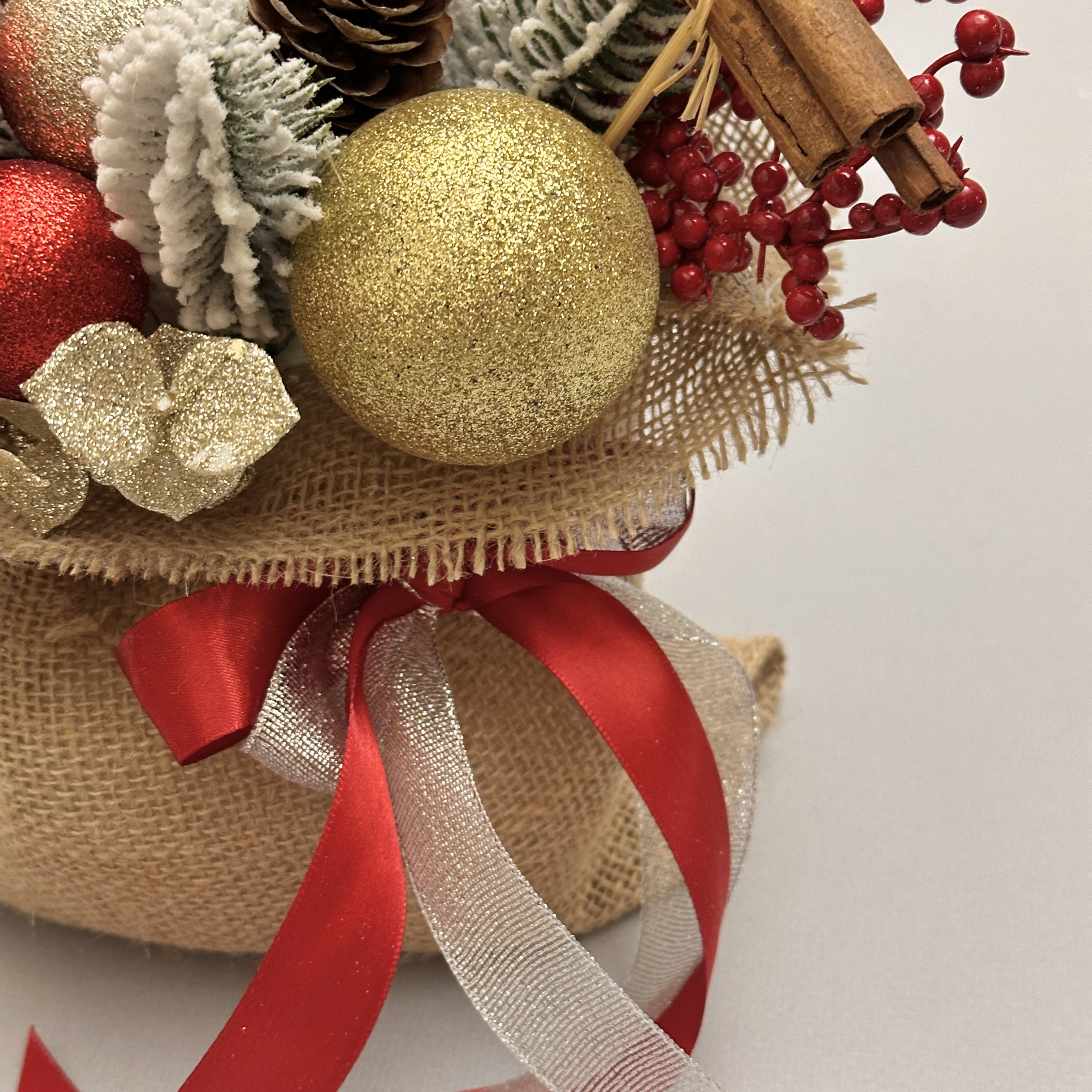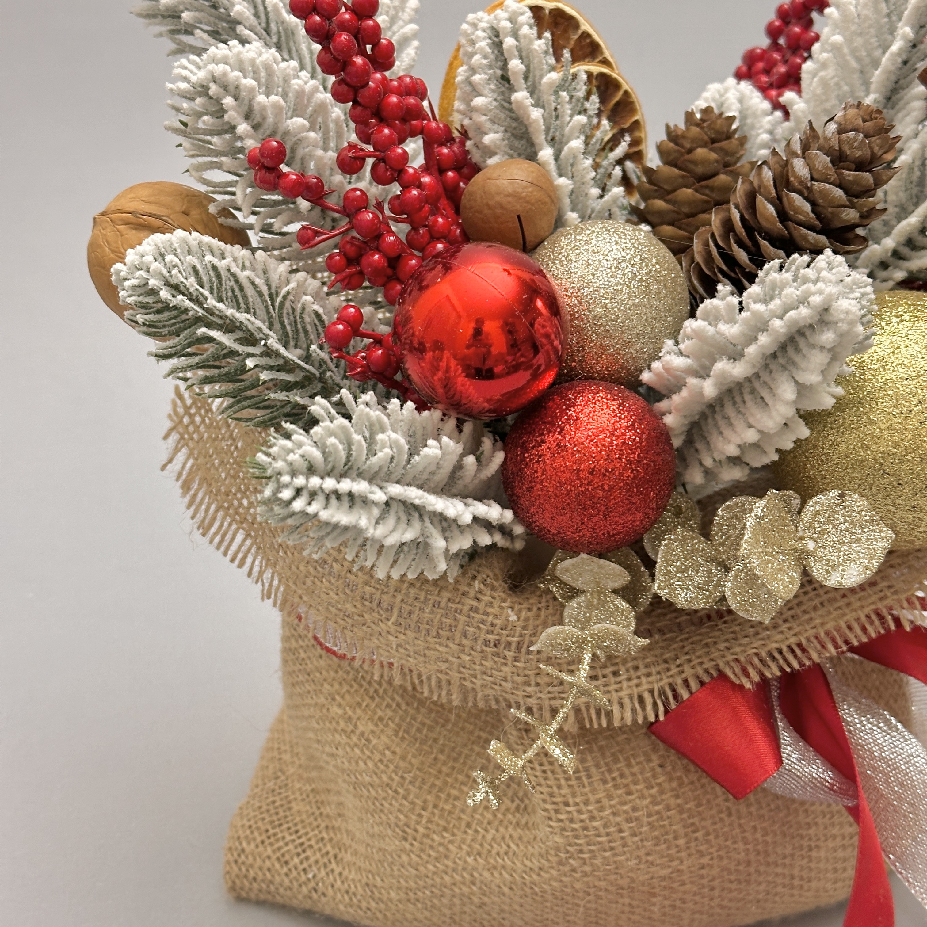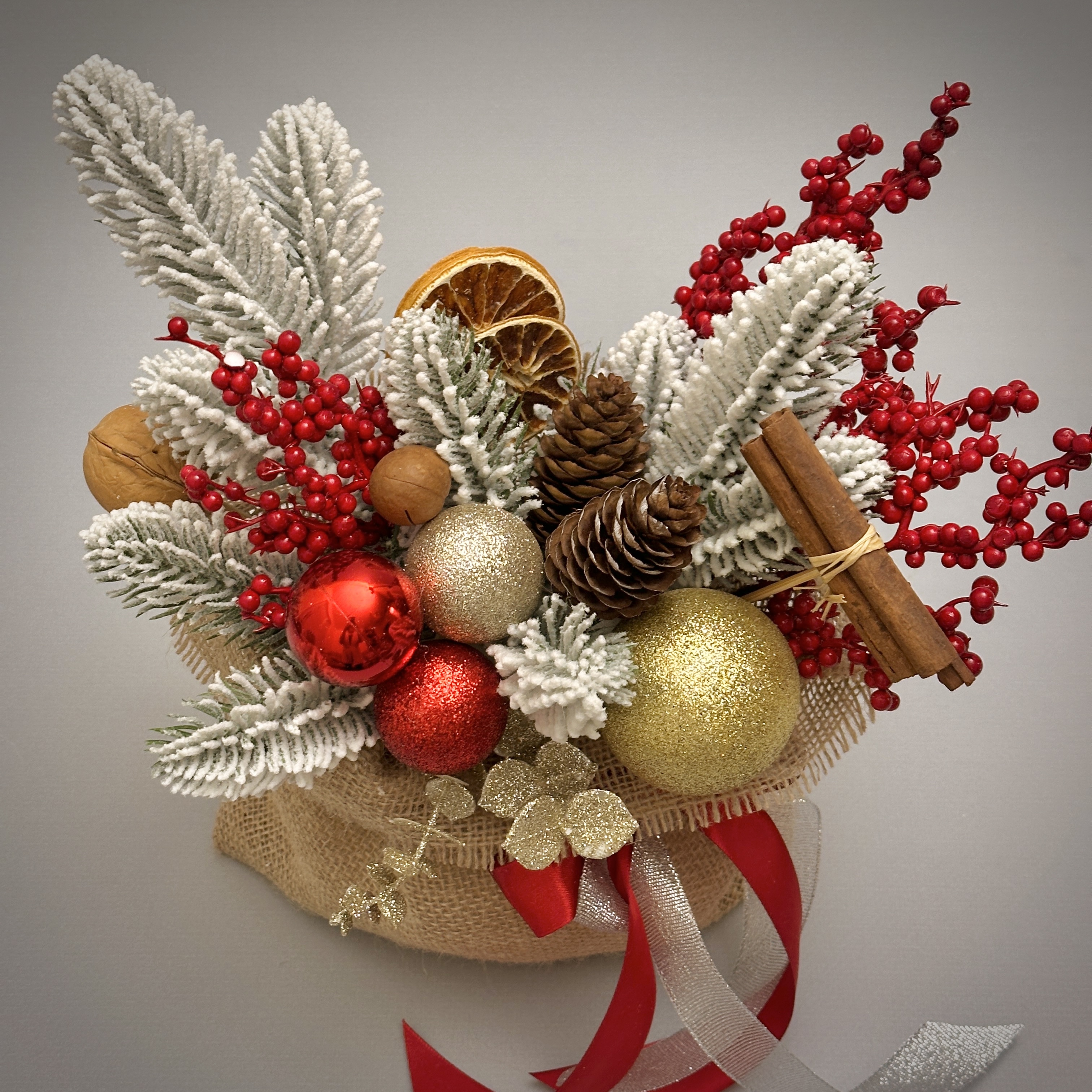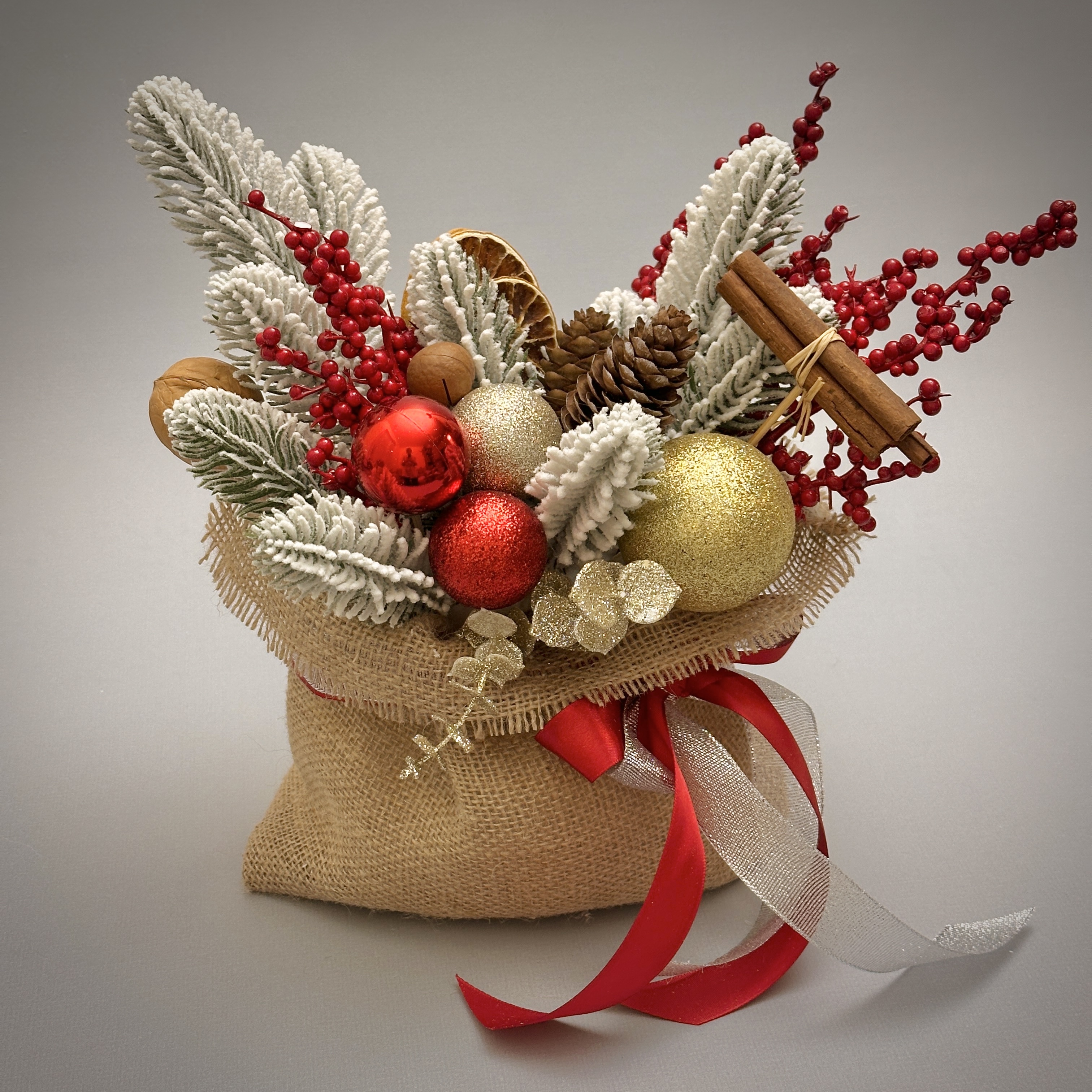 Новогодняя композиция в волшебном мешочке словно наполнена теплом зимнего вечера. Заснеженные еловые ветки, яркие красные ягоды, золотые шары, шишки и палочки корицы создают ощущение уюта, как в доме, где уже пахнет праздником. Декоративный мешочек с лентами добавляет душевности и делает композицию идеальным украшением или подарком с настроением.