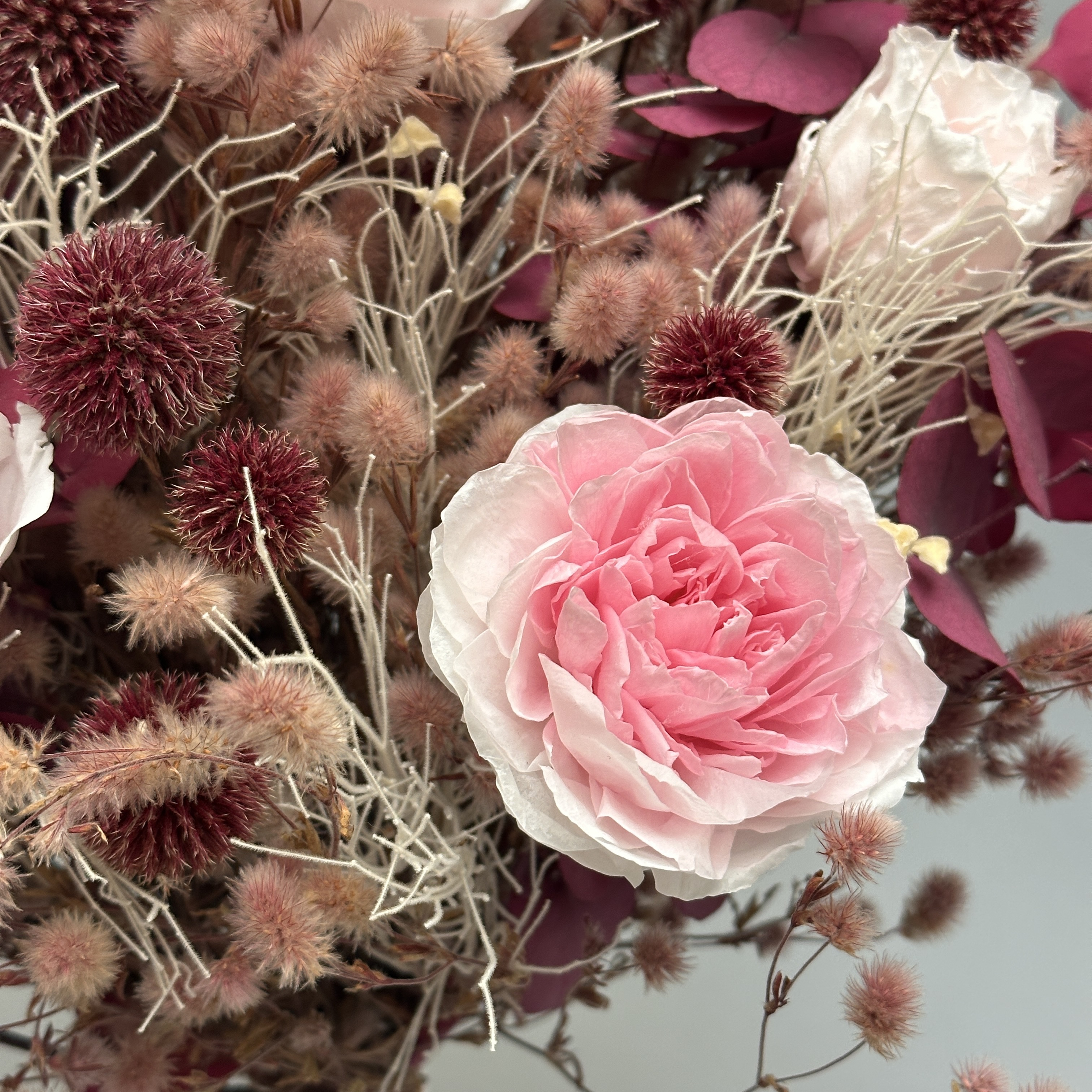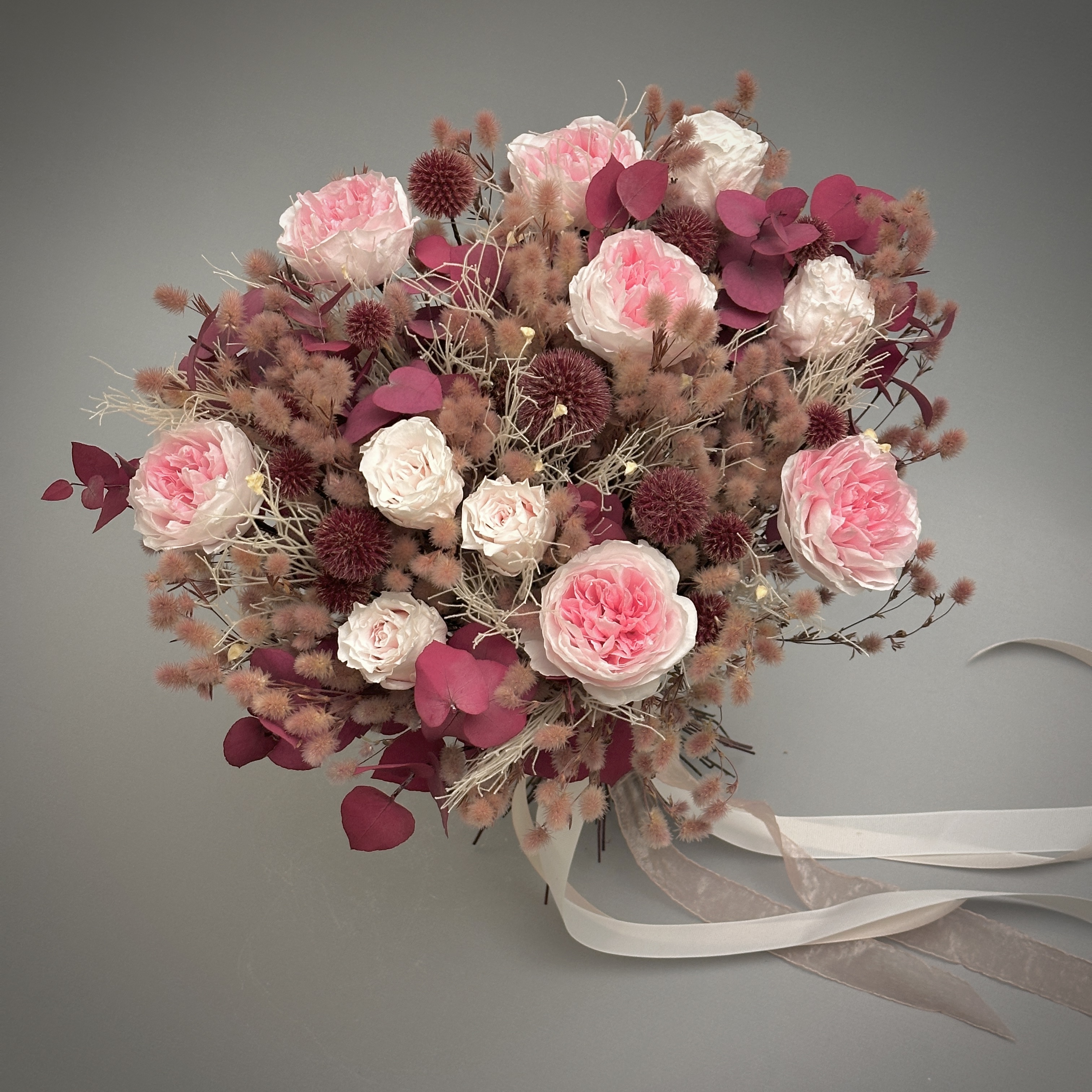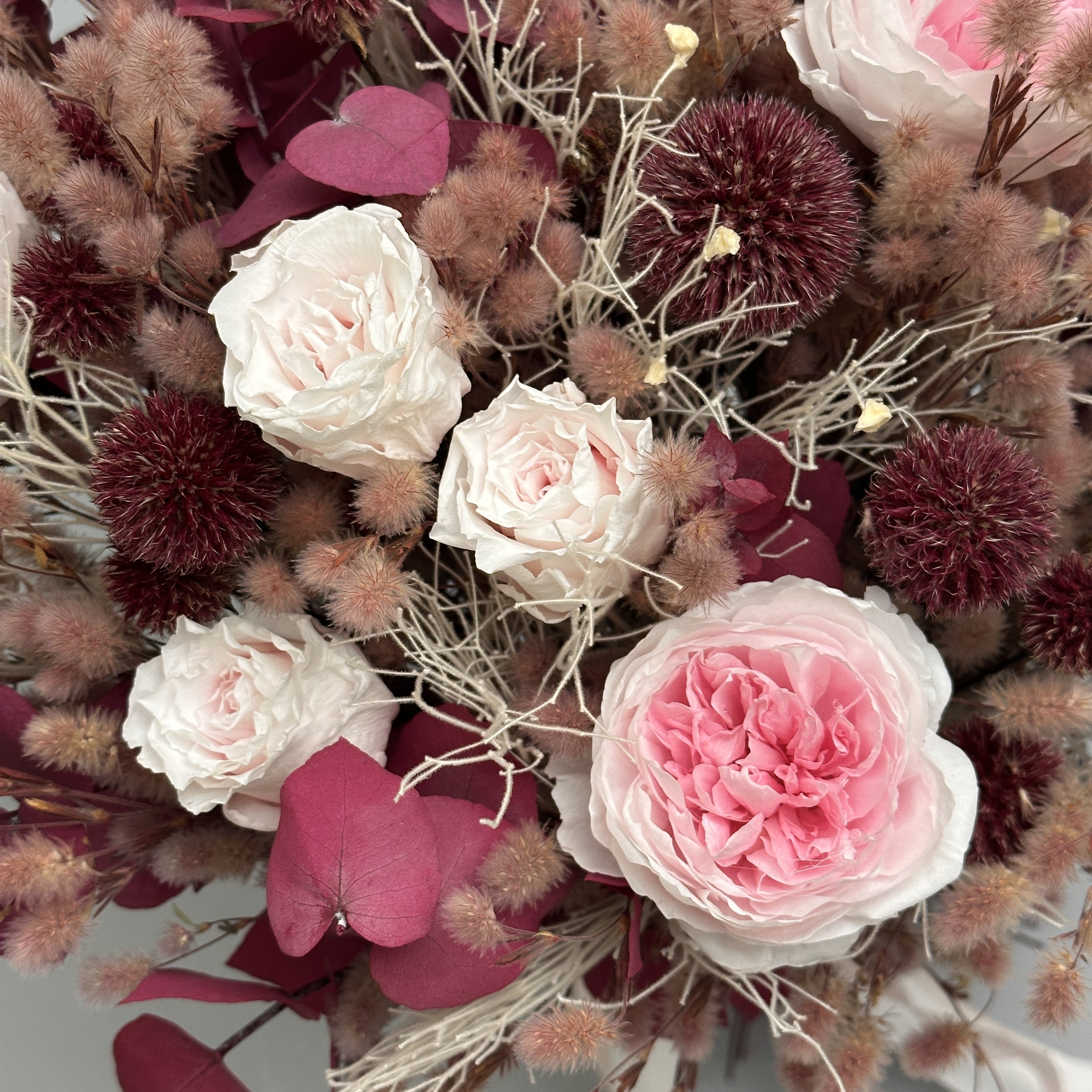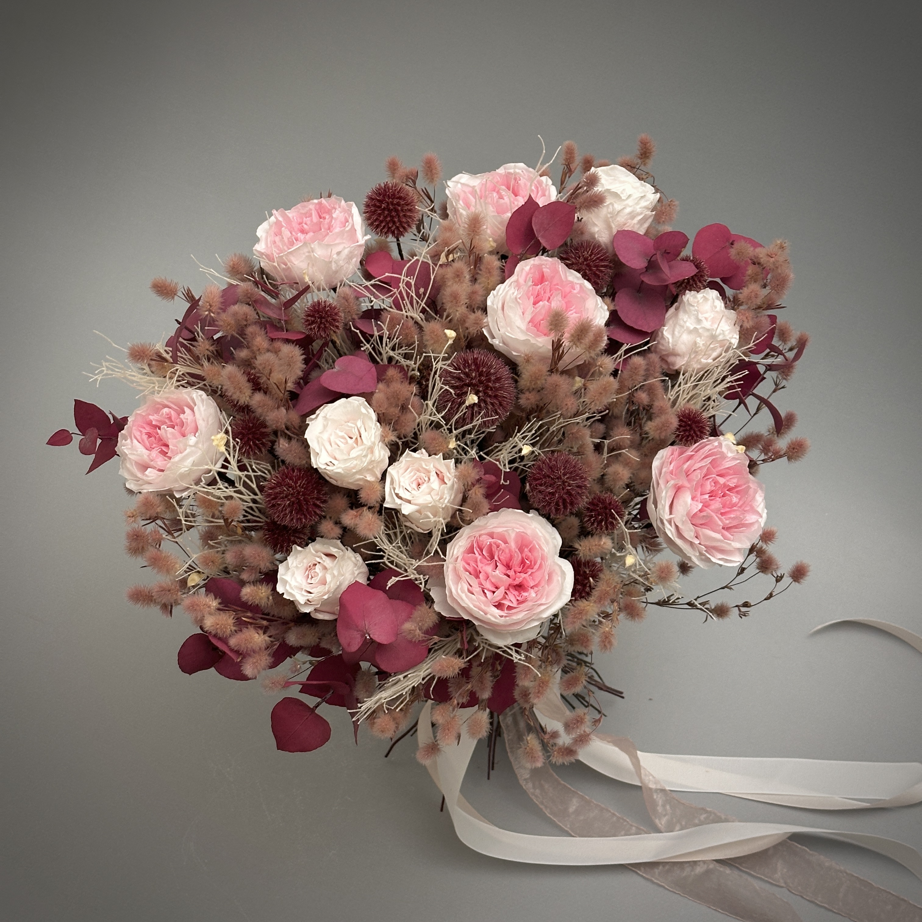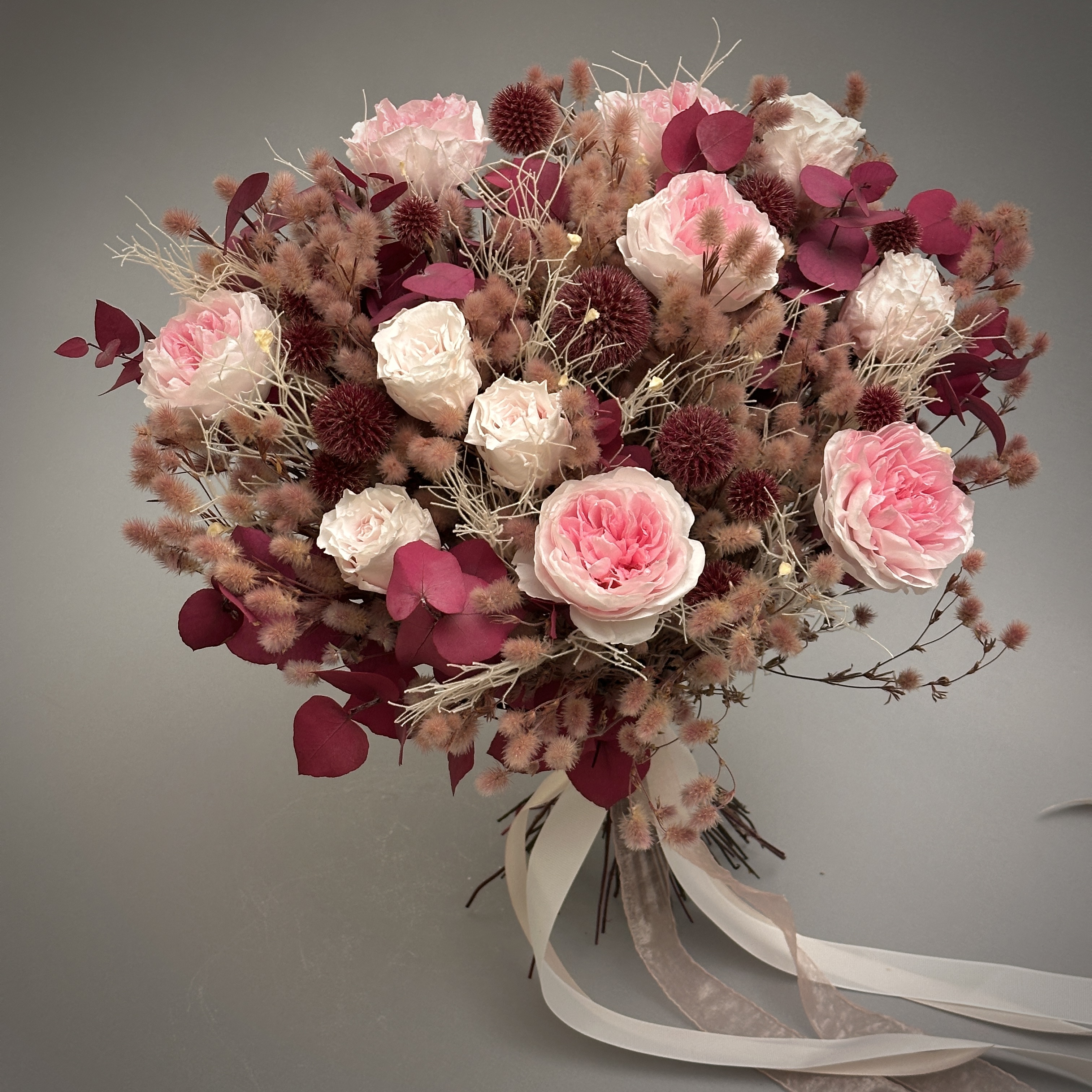 Изысканный интерьерный букет из стабилизированных цветов в бело-розовой, бордовой гамме. Красивое сочетание пионовидных роз, пушистого клевера, колючего мордовника в обрамлении бордового эвкалипта. Романтика и нежность, страсть и любовь соединились в одном букете.