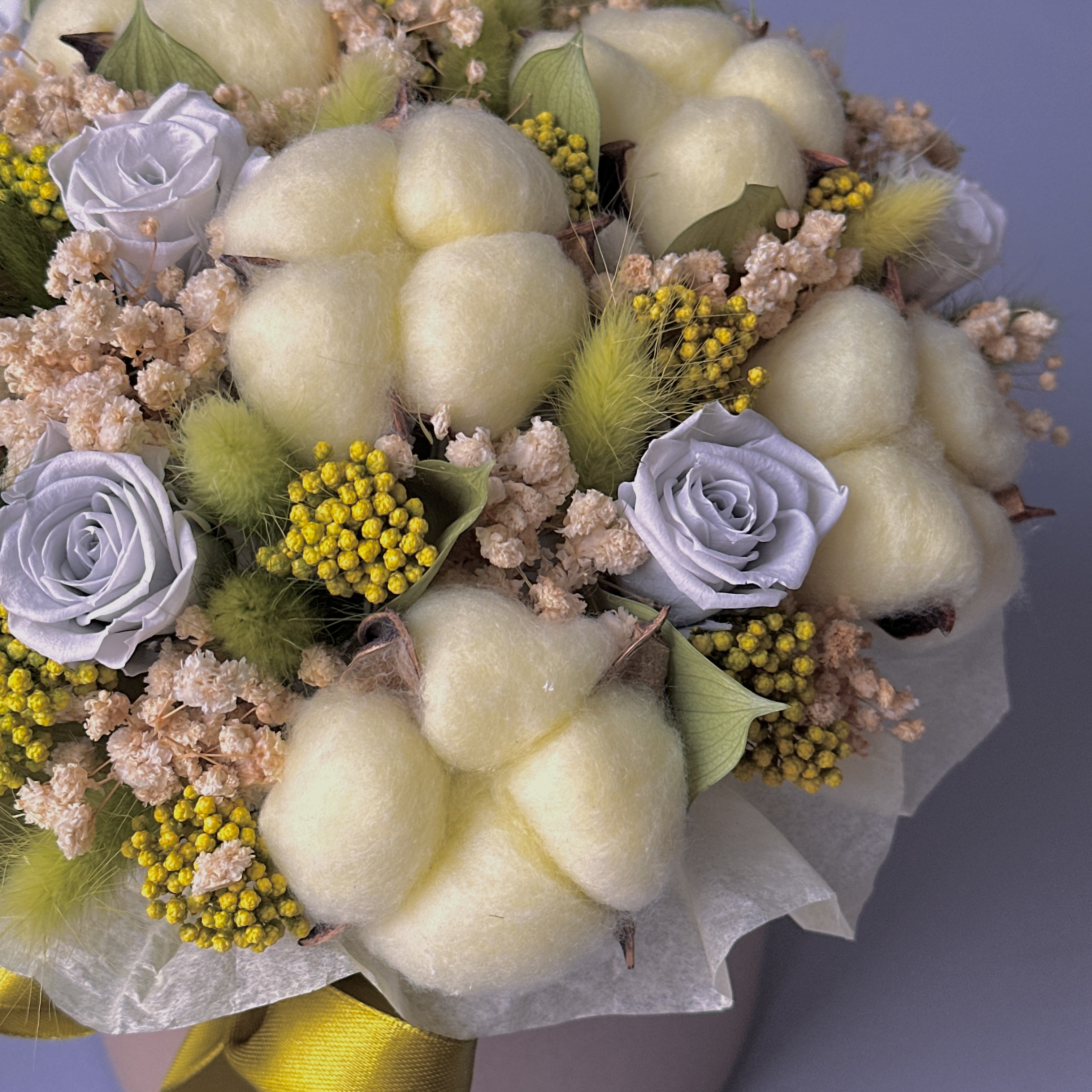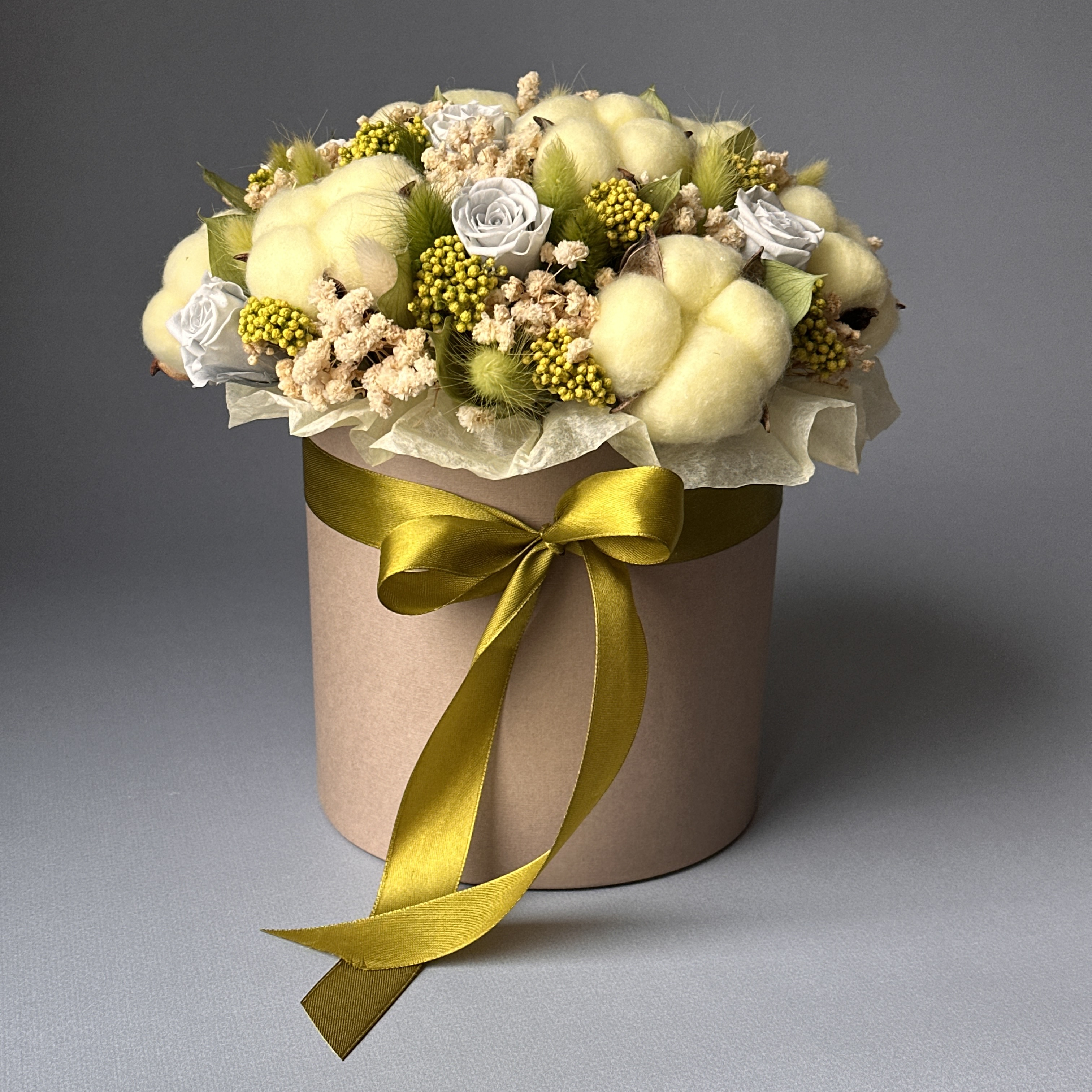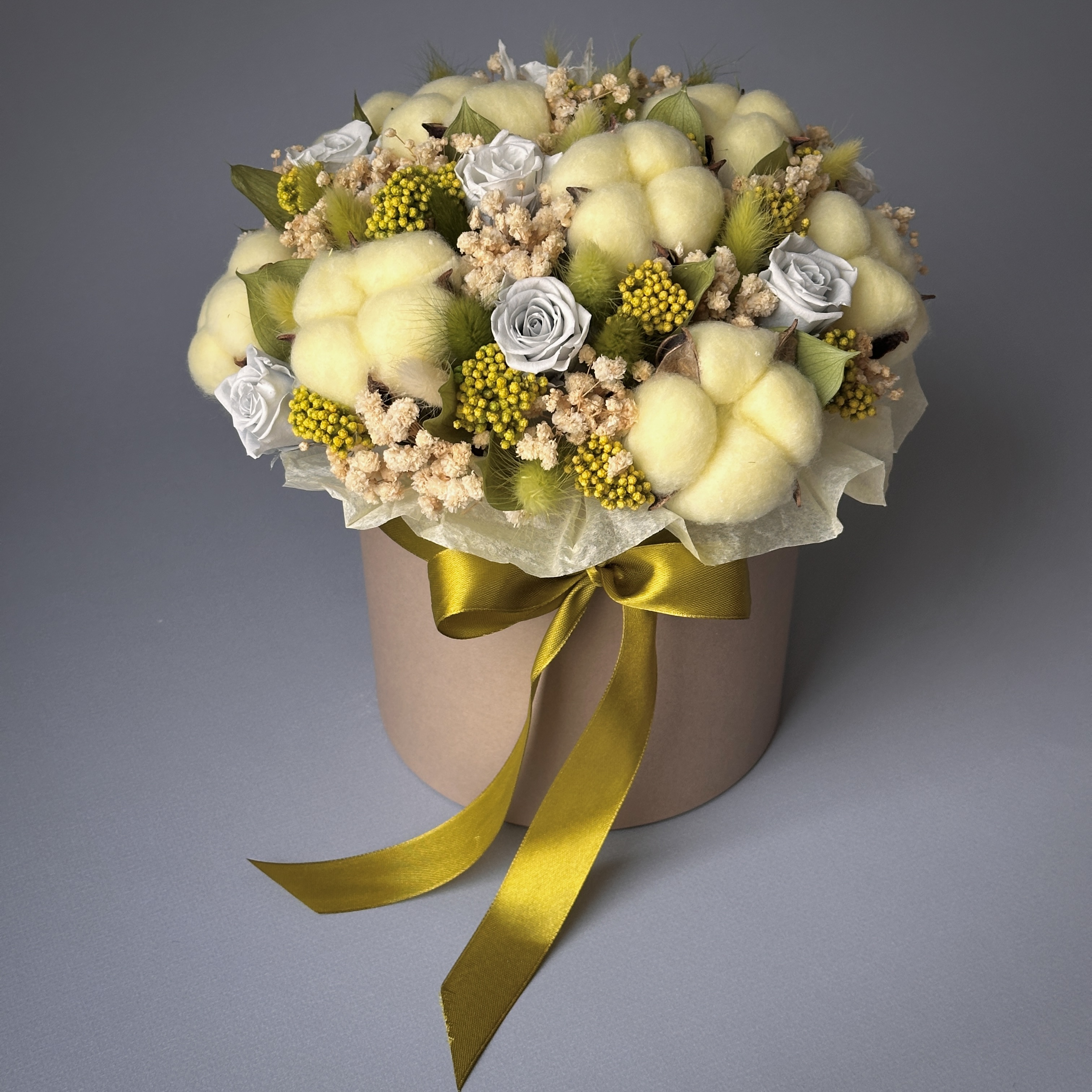Сочная композиция в шляпной крафтовой коробке в лимонных оттенках. Нежные розы в окружении солнечного хлопка, игривых горошков озотамнуса, пушистого лагуруса наполнит пространство колоритом цвета и теплом.