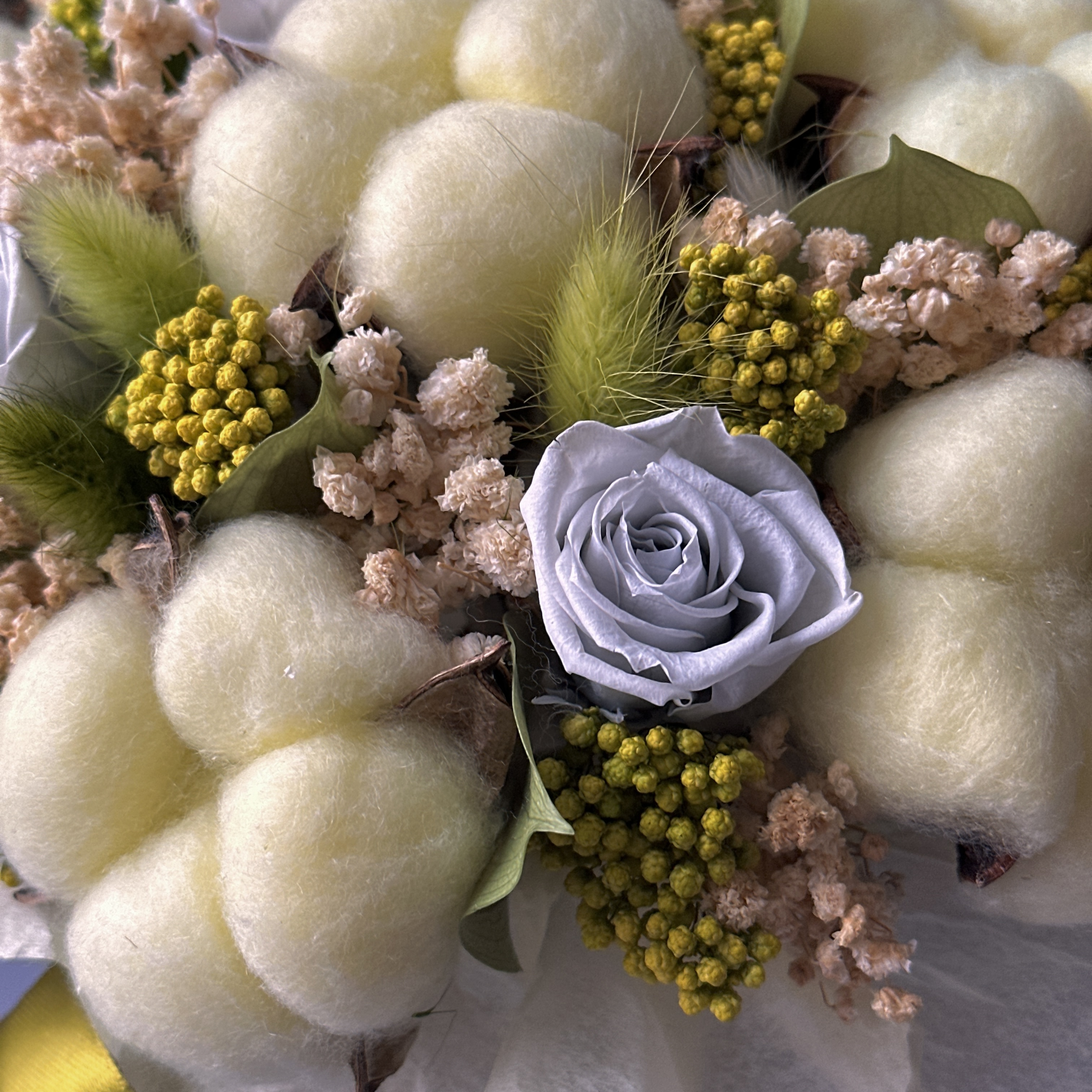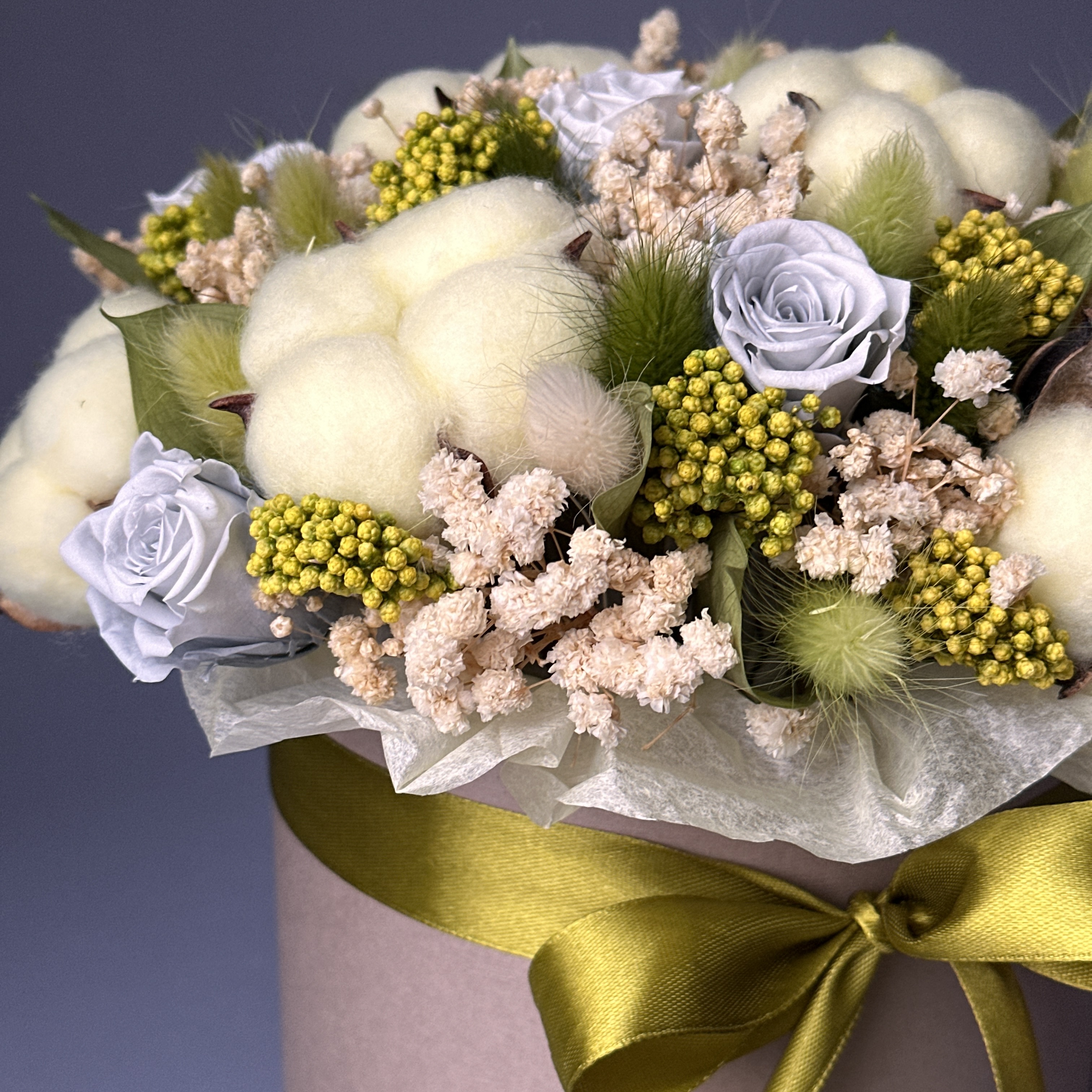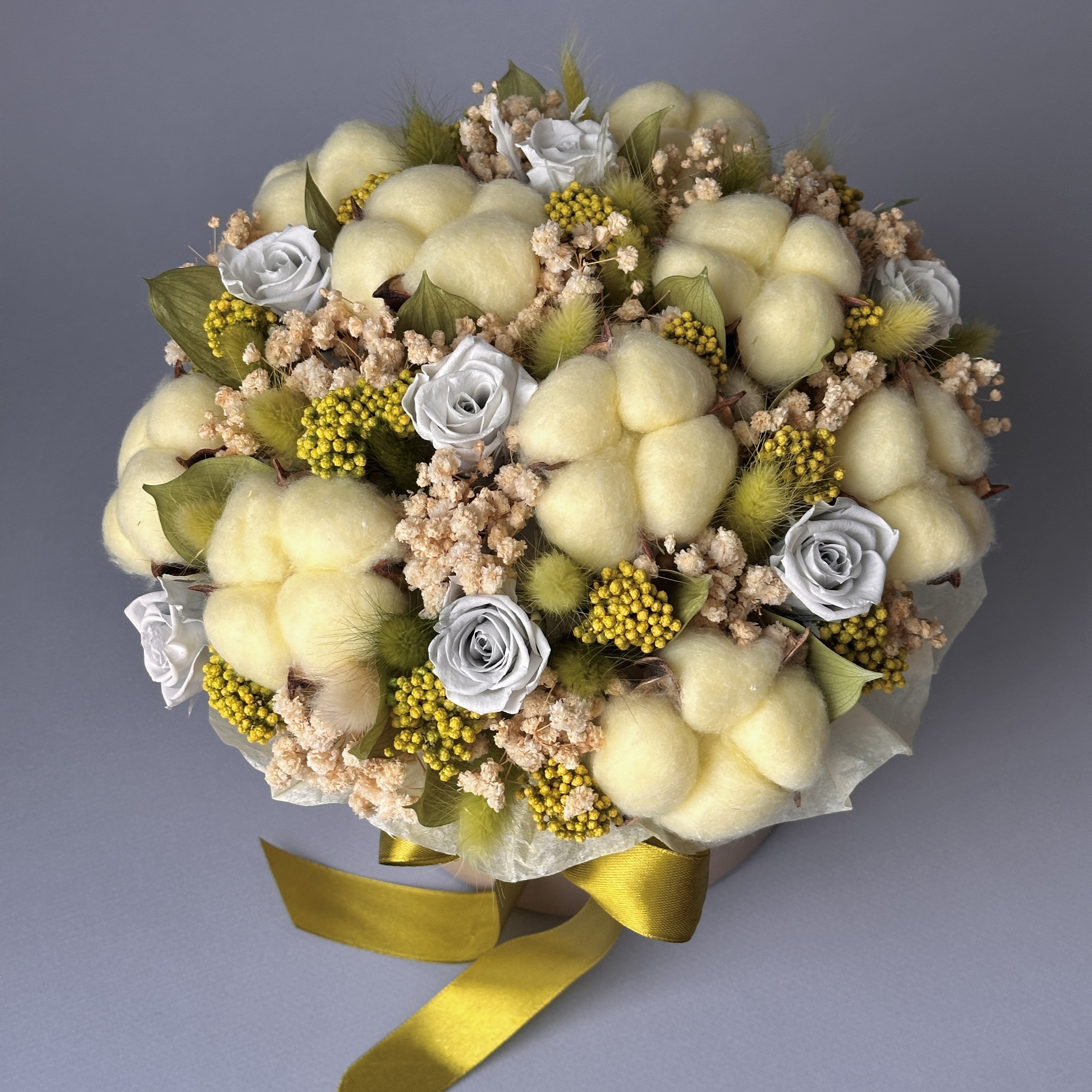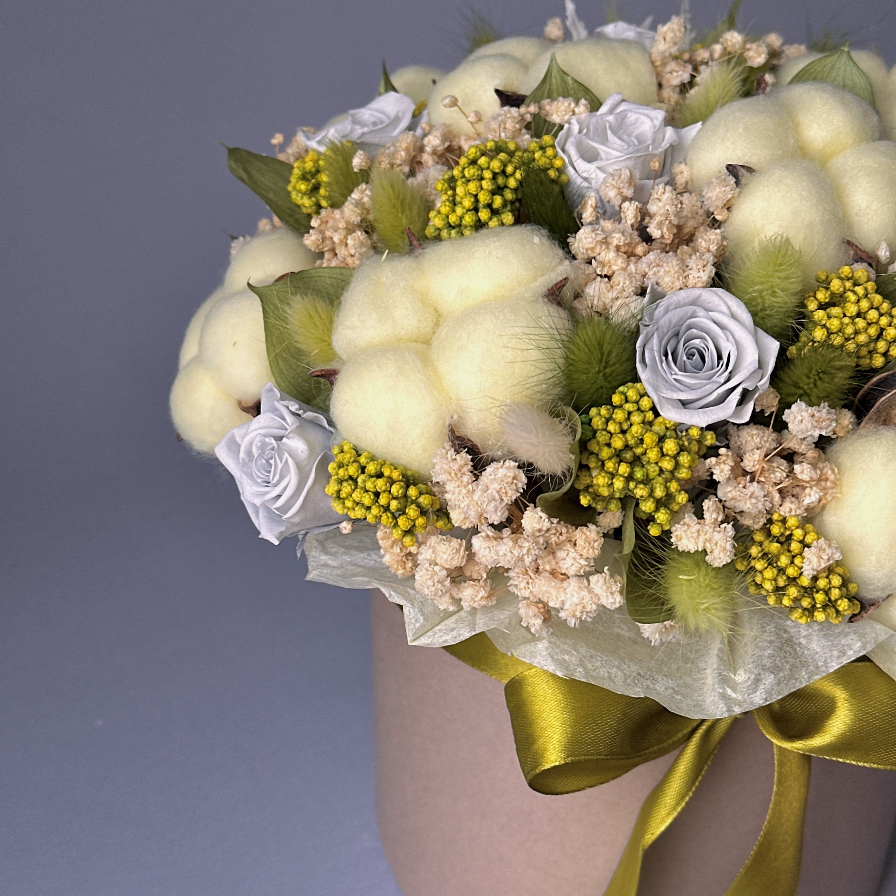 Сочная композиция в шляпной крафтовой коробке в лимонных оттенках. Нежные розы в окружении солнечного хлопка, игривых горошков озотамнуса, пушистого лагуруса наполнит пространство колоритом цвета и теплом.